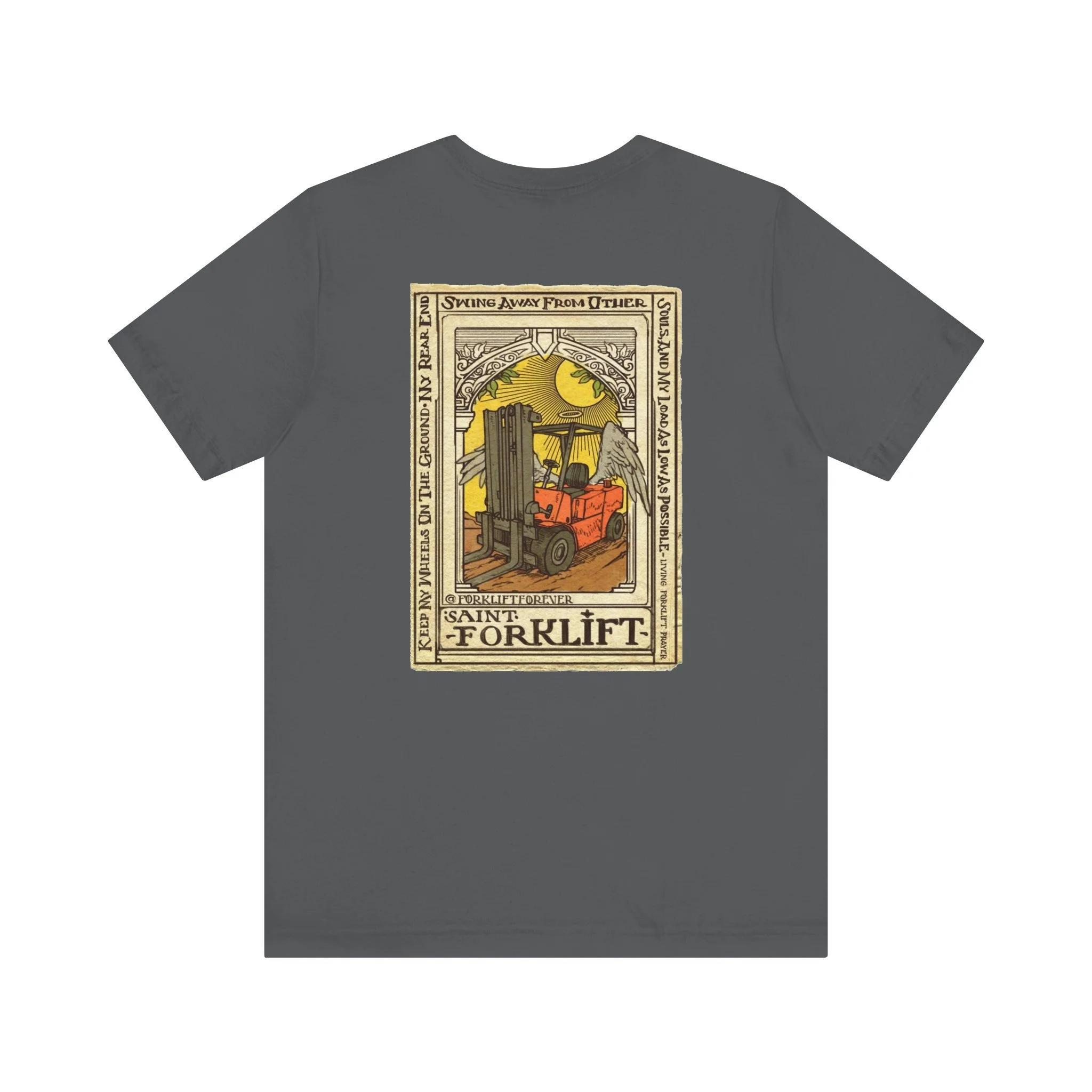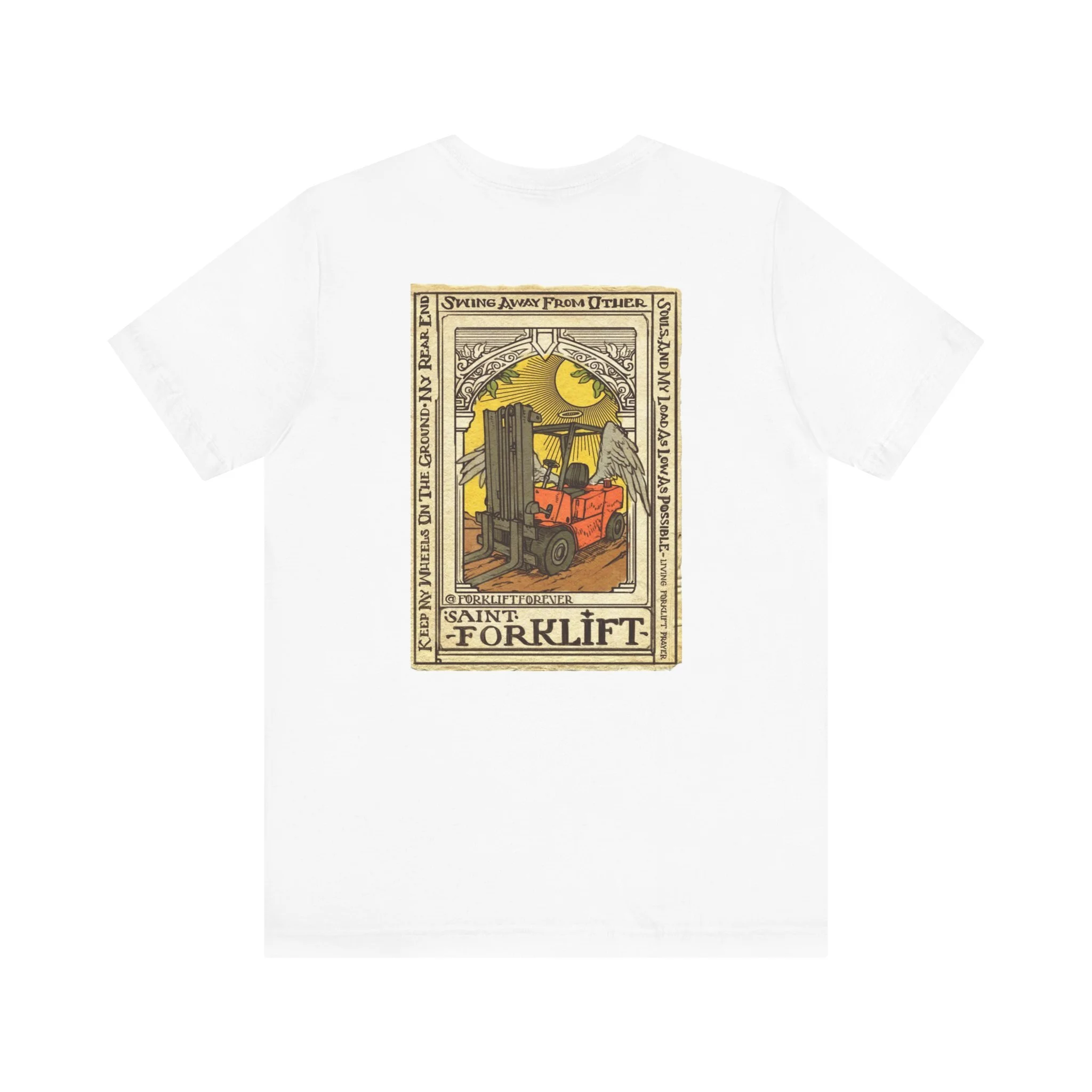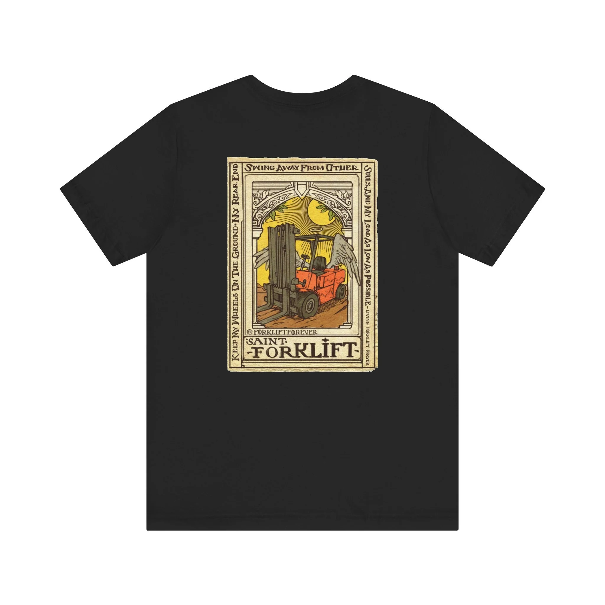 Forklift Certified t-shirt original design by Alberto Castillo for Forklift Forever. A living forklift prayer from St. Forklift "Keep my wheels on the ground, my rear end swing away from other souls, and my load as low as possible." Perfect for the warehouse or out and about.